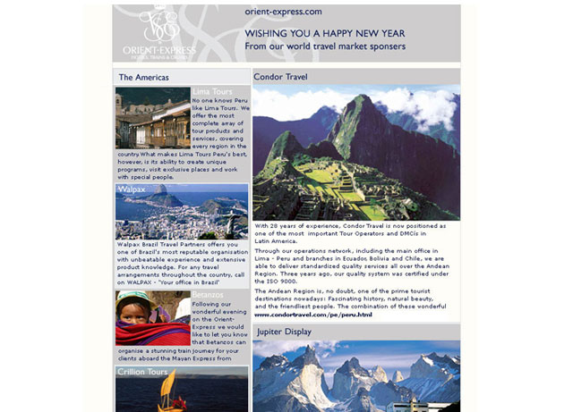 Approach: As brand guardian I helped plan campaign promotions via microsites, weekly HTML emails and an Orient-Express online magazine.