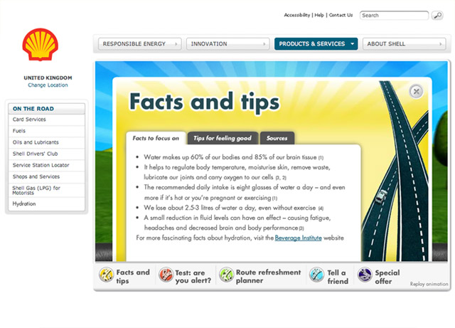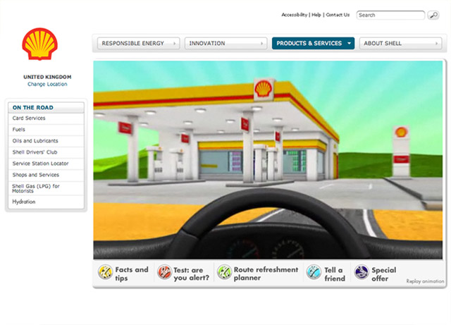 Approach: As lead agency designer and brand guardian my team rolled out multiple campaigns for Shell. Here an animated banner highlighting the importance of keeping hydrated while driving. I created the concept, the look and feel, then directed our animation team, plus an external 3D animation team. I also liaised with the agency creating the offline material.